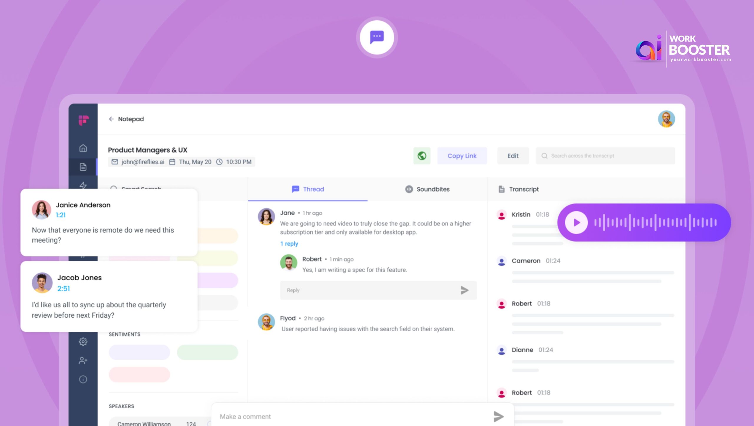 Met Fireflies hoef je nooit meer aantekeningen te maken tijdens een meeting. Terwijl jij focust op het gesprek, zorgt de tool voor een volledig transcript, gemarkeerde actiepunten en heldere samenvatting. Je bespaart tijd, voorkomt miscommunicatie en hebt altijd een back-up van wat besproken is. Vooral bij lange overleggen of veel back-to-back meetings is Fireflies een gamechanger.